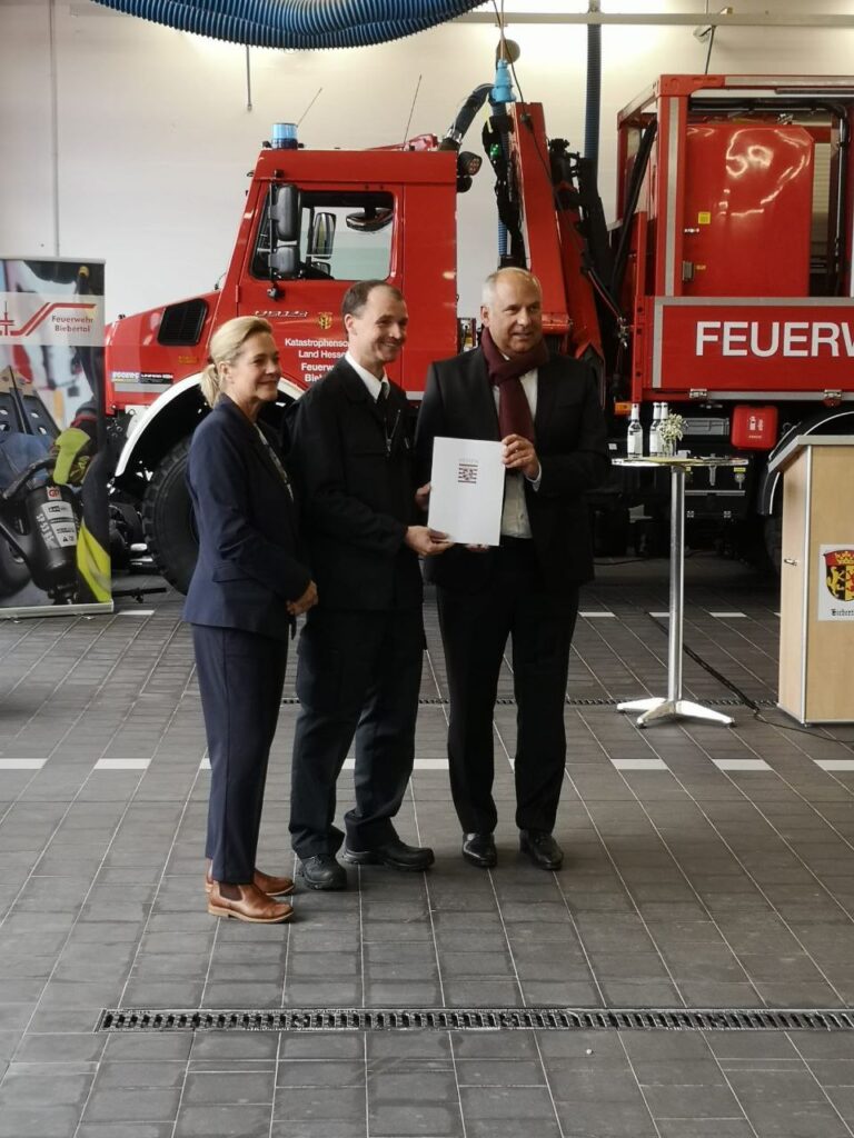 Bürgermeisterin Patricia Ortmann, Gemeindebrandinspektor Marcel Hänsel, Hessische Innenminister Prof. Dr. Roman Poseck