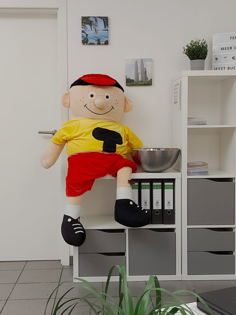 Vor 48 Jahren gründete Dieter Fröhlich eine Musikschule in Eschenburg unter dem Motto „Musik macht fröhlich. Und klüger“. Wann das Maskottchen Theo hinzu kam, konnte ich nicht ersehen. Theo erklärt Kindern die Welt der Noten und lebt als Puppe auch in vielen Kinderzimmern. Jedenfalls war das Konzept des Musikunterrichts so erfolgreich, dass man in anderen Orten nach Filialen fragte. Nach der Wende holte Dieter Fröhlich Musiklehrer aus der ehemaligen DDR ins Boot. Anfang der 1990er Jahre gründete er das erste Franchise-Unternehmen im Musikbereich. Die Franchisenehmer taten sich zusammen als gemeinsame Bigbands. Und sie wollten was von der Welt sehen. „80 Personen?“ In den Reisebüros war man begeistert. „Ja, aber hinzu kommen die Instrumente“. „Ach nein, das wird problematisch.“ Also versuchte Herr Fröhlich, den Transport auf eigene Faust zu organisieren. Und hier kam Frank Burk aus dem nahe gelegenen Steffenberg ins Boot. Er unterstützte Dieter Fröhlich bei der Reiseorganisation.